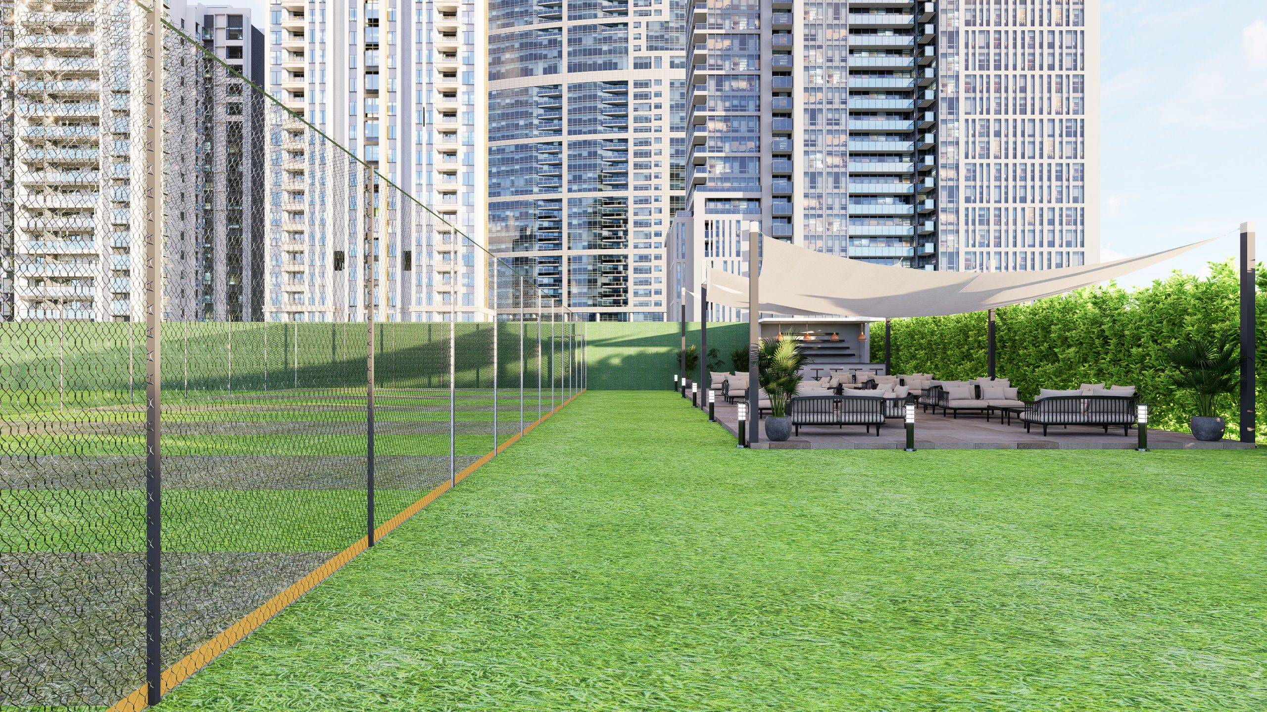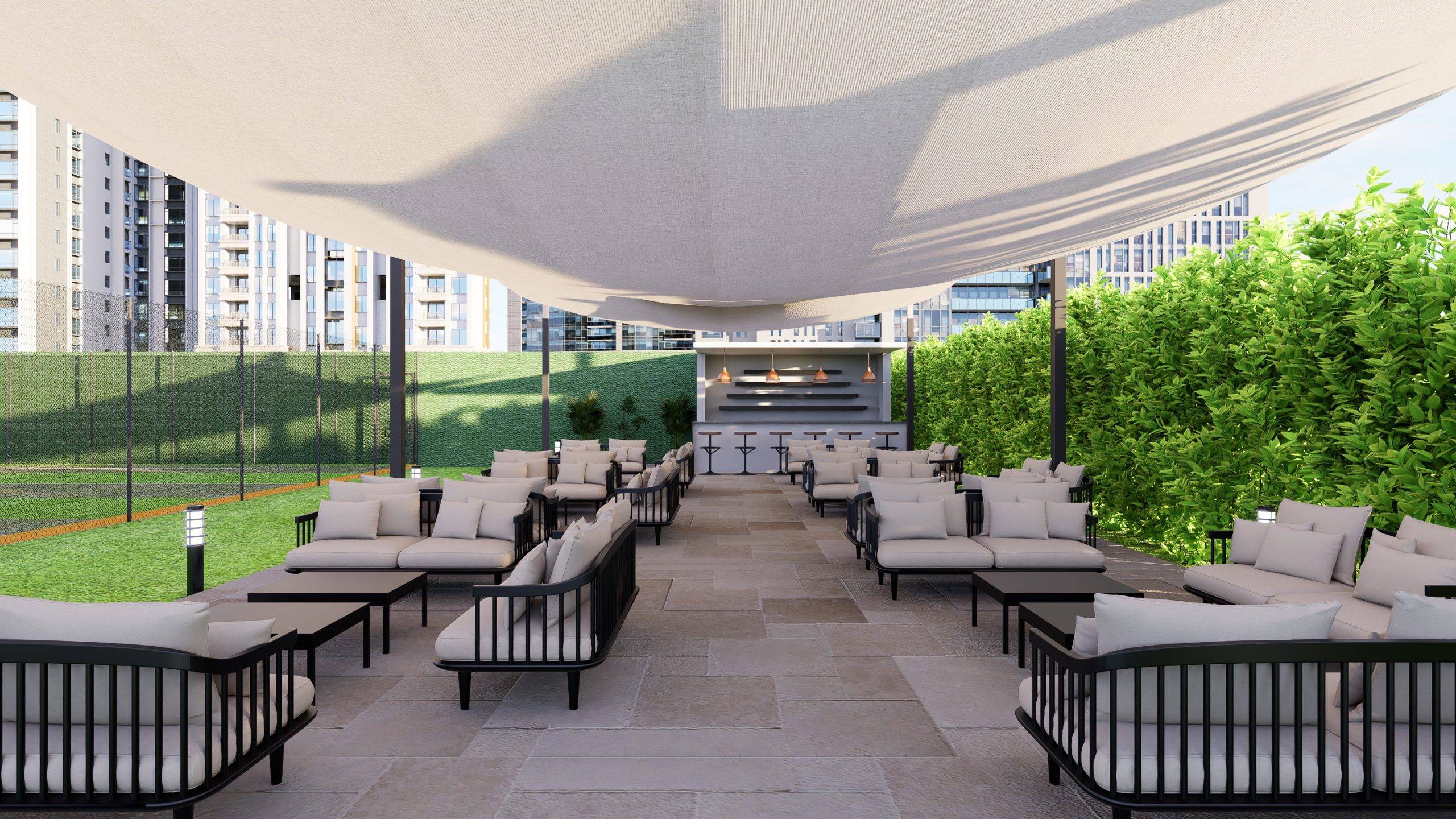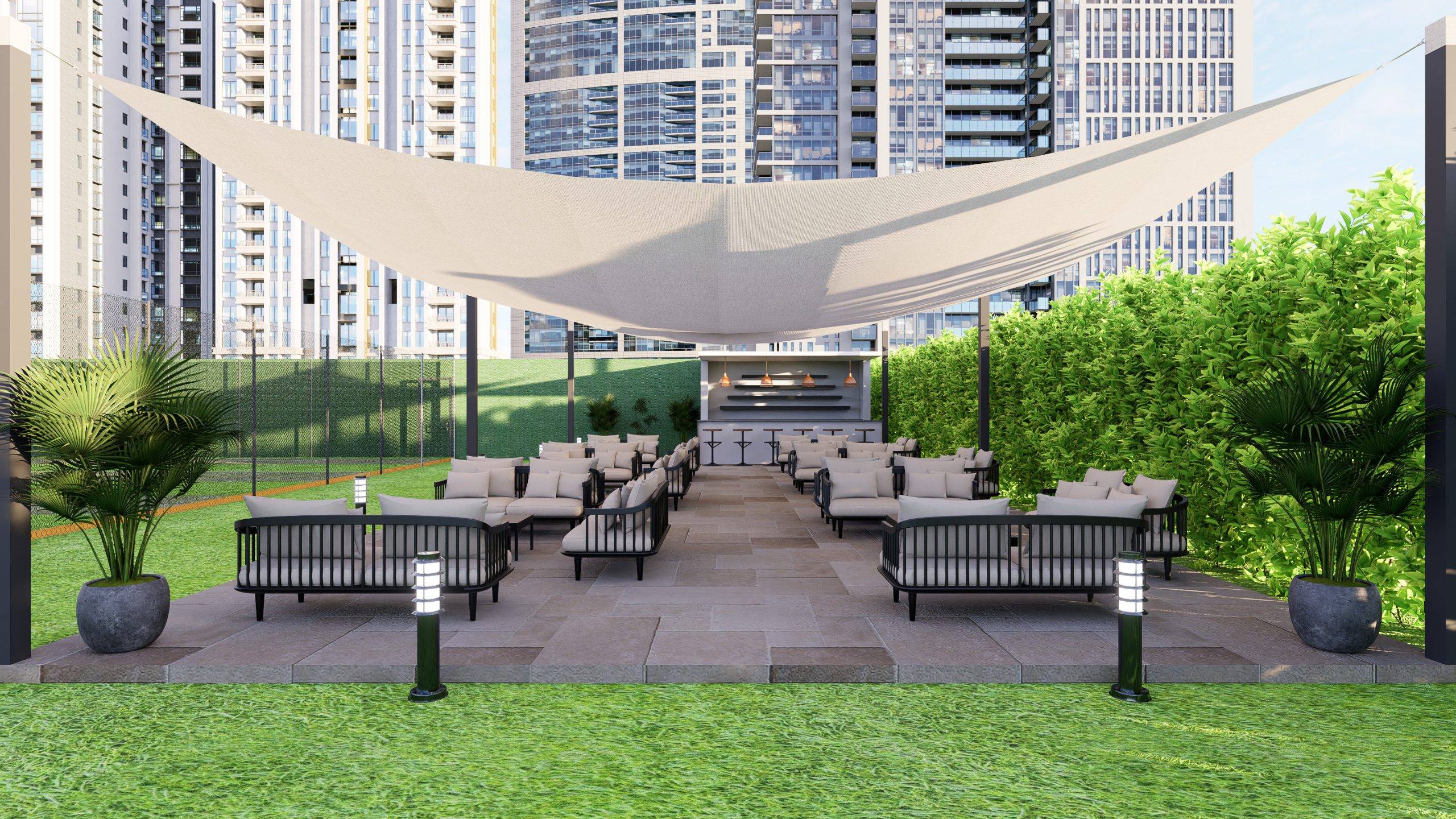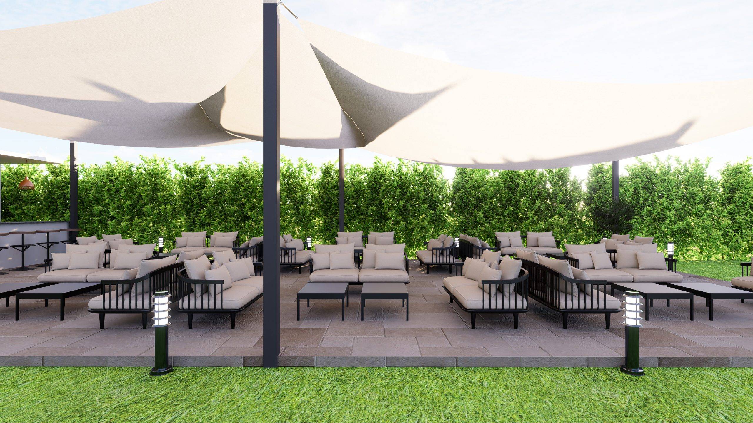 Our design approach focused on creating an open yet defined outdoor pavilion that blends relaxation with functionality. A large tensile canopy structure forms the centerpiece of the design, providing shade and weather protection while maintaining an airy, lightweight architectural presence. Beneath the canopy, seating is arranged in organized clusters to encourage both small group conversations and larger social gatherings. The bar counter positioned at the far end of the space acts as a focal point and service hub, reinforcing the area’s role as a social extension of the sports facility.