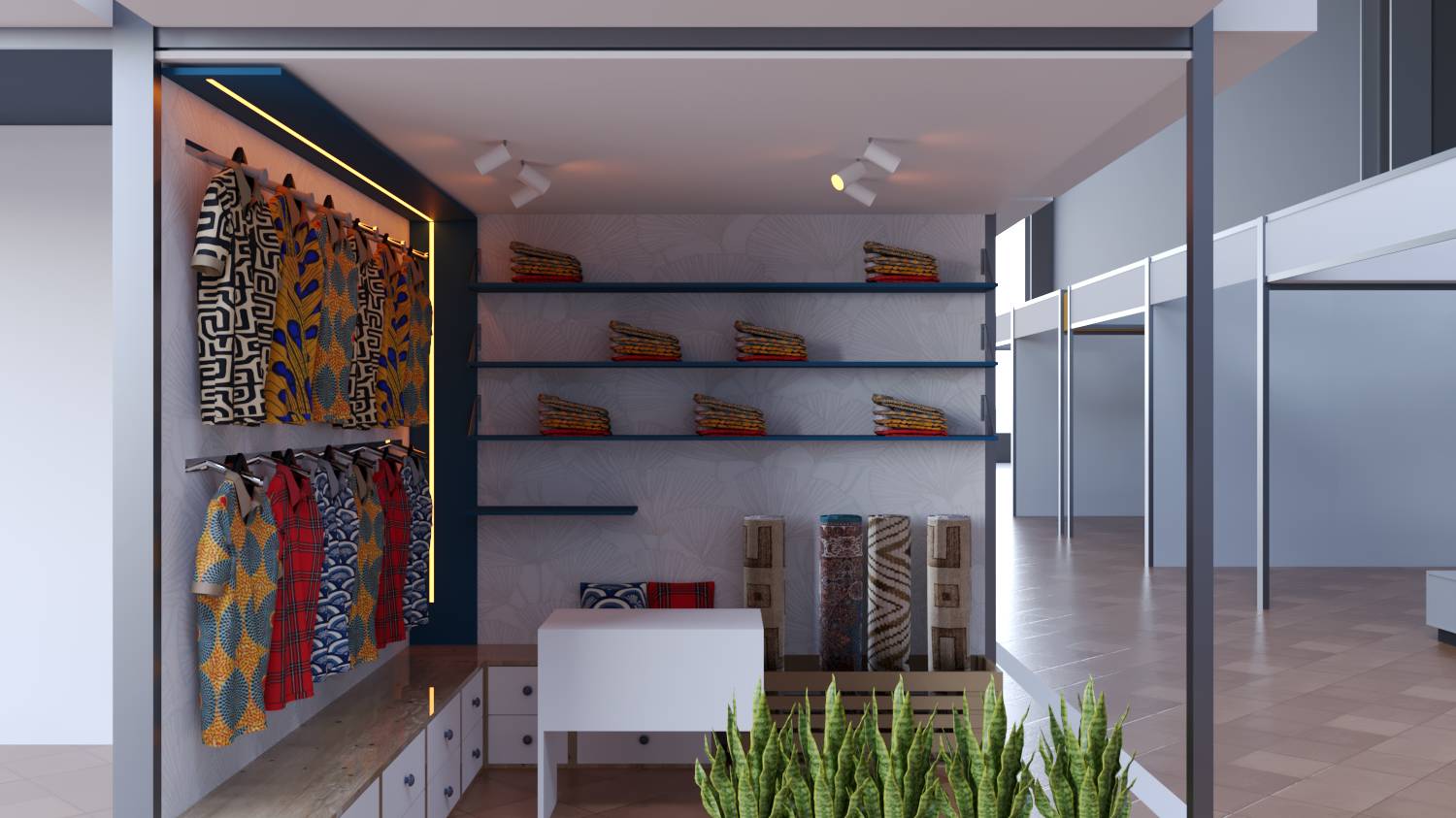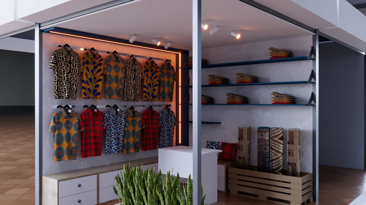 This project involved the development of a 3D retail display concept designed to showcase patterned garments and textiles within a compact, open retail environment. The client’s brief was to create a visually engaging shop module that would highlight the vibrancy and cultural richness of the products while maintaining a clean and organized retail layout. The space needed to support both hanging garments and folded textile displays, allowing customers to easily browse while ensuring the merchandise remained the focal point.